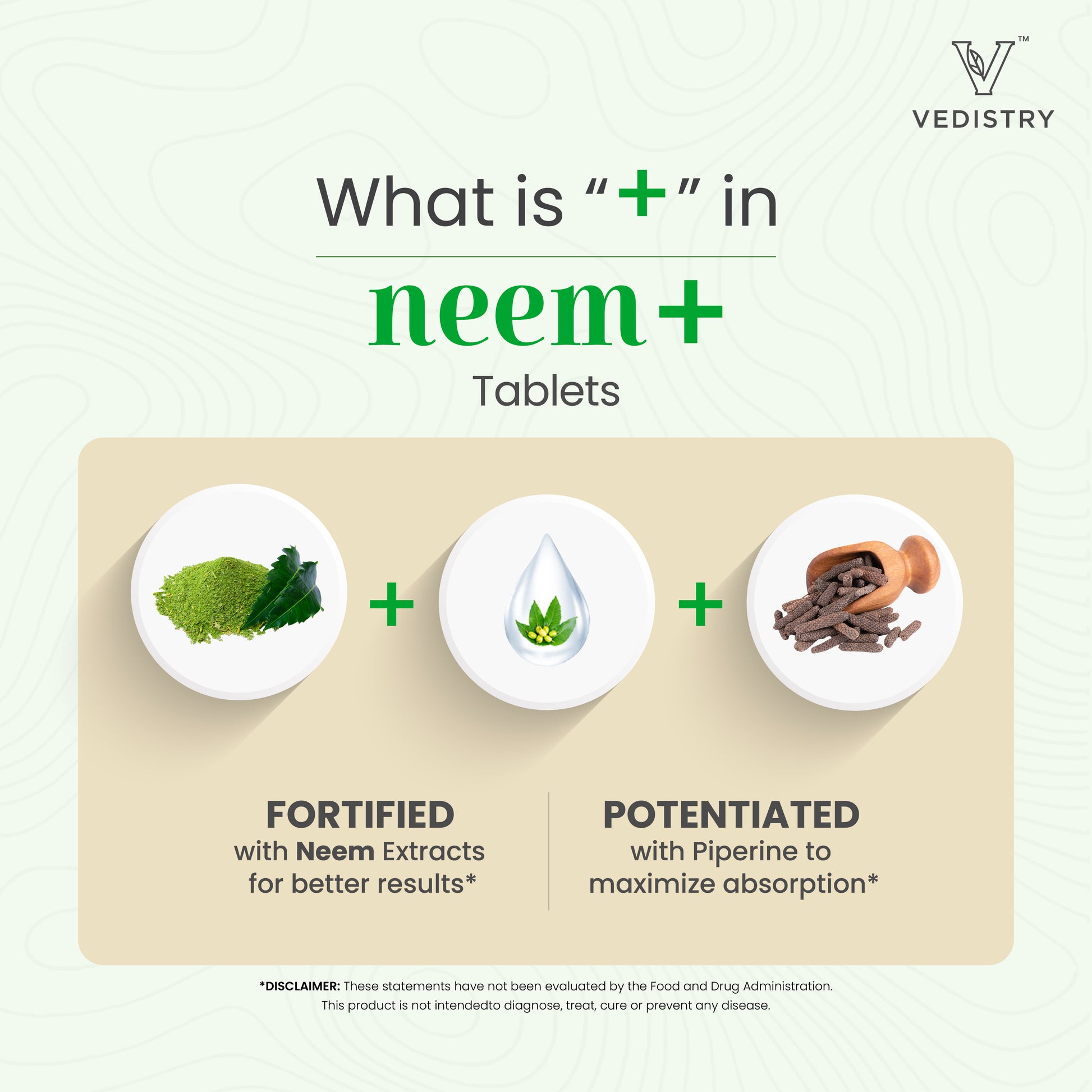 - FORTIFIED FOR BETTER RESULTS: Vedistry neem+ tablets are fortified with Bhavna process for better results. Bhavna is a traditional and proven Ayurveda process of blending powders with liquid for better efficacy.