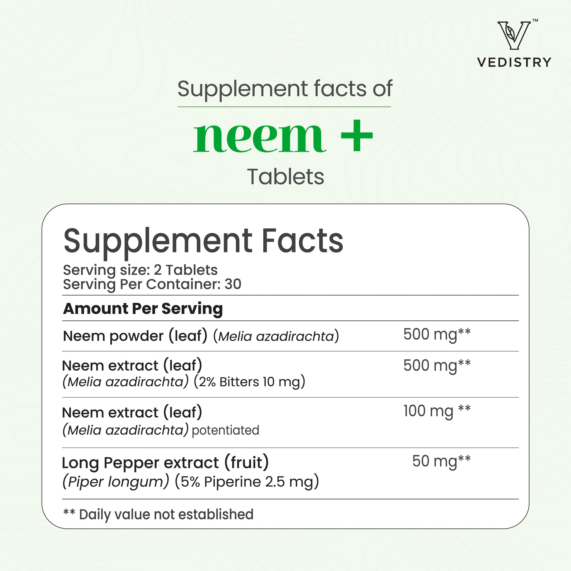 - MAXIMIZED ABSORPTION AND ENHANCED BIOAVAILABILITY: Research clearly shows Piperine enhances bioavailability with better absorption. Vedistry neem+ tablets have piperine for better absorption and bio-availability