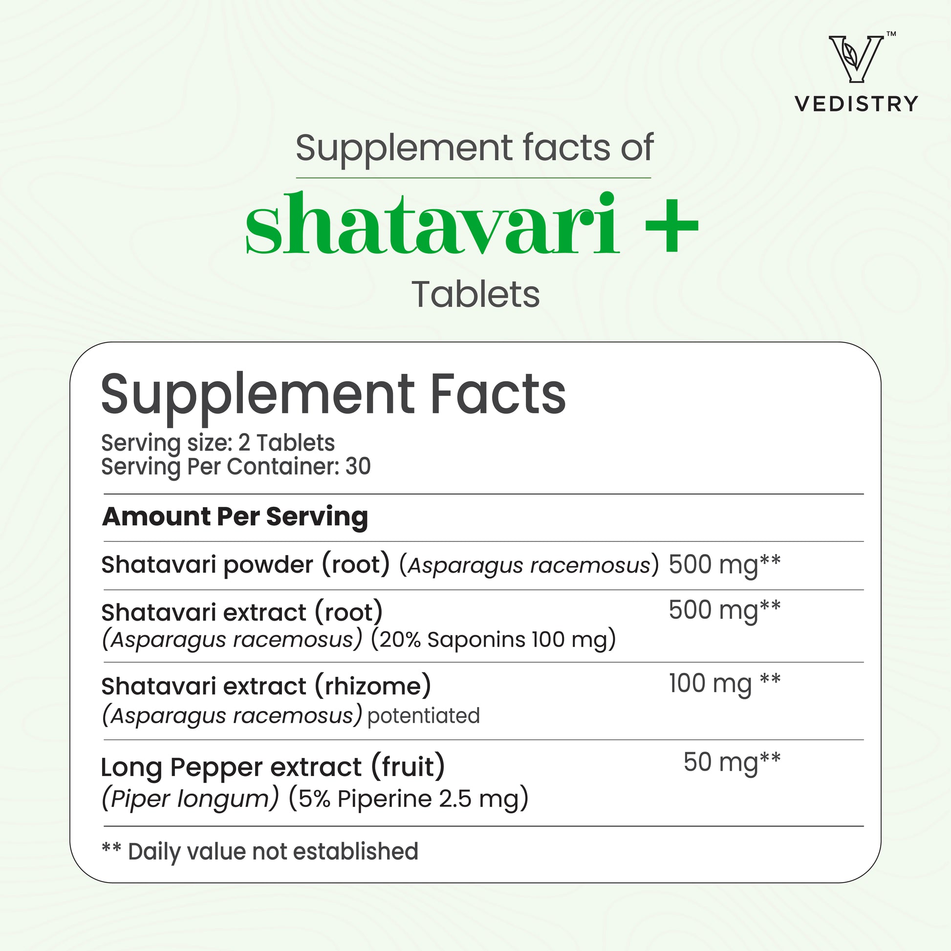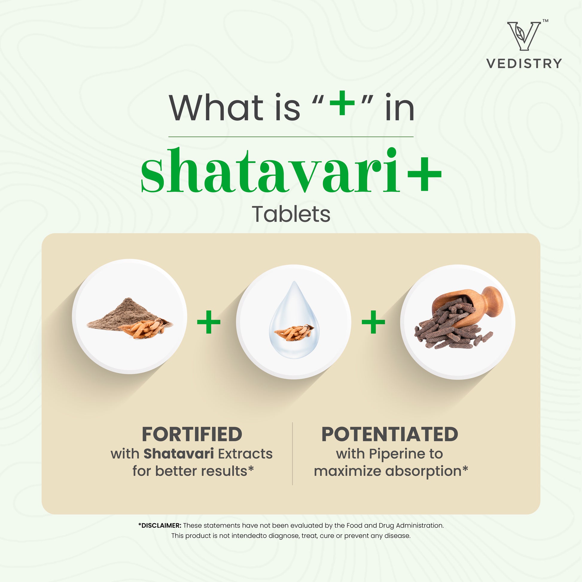 - FORTIFIED FOR BETTER RESULTS: Vedistry shatavari+ tablets are fortified with Bhavna process for better results. Bhavna is a traditional and proven Ayurveda process of blending powders with liquid for better efficacy.